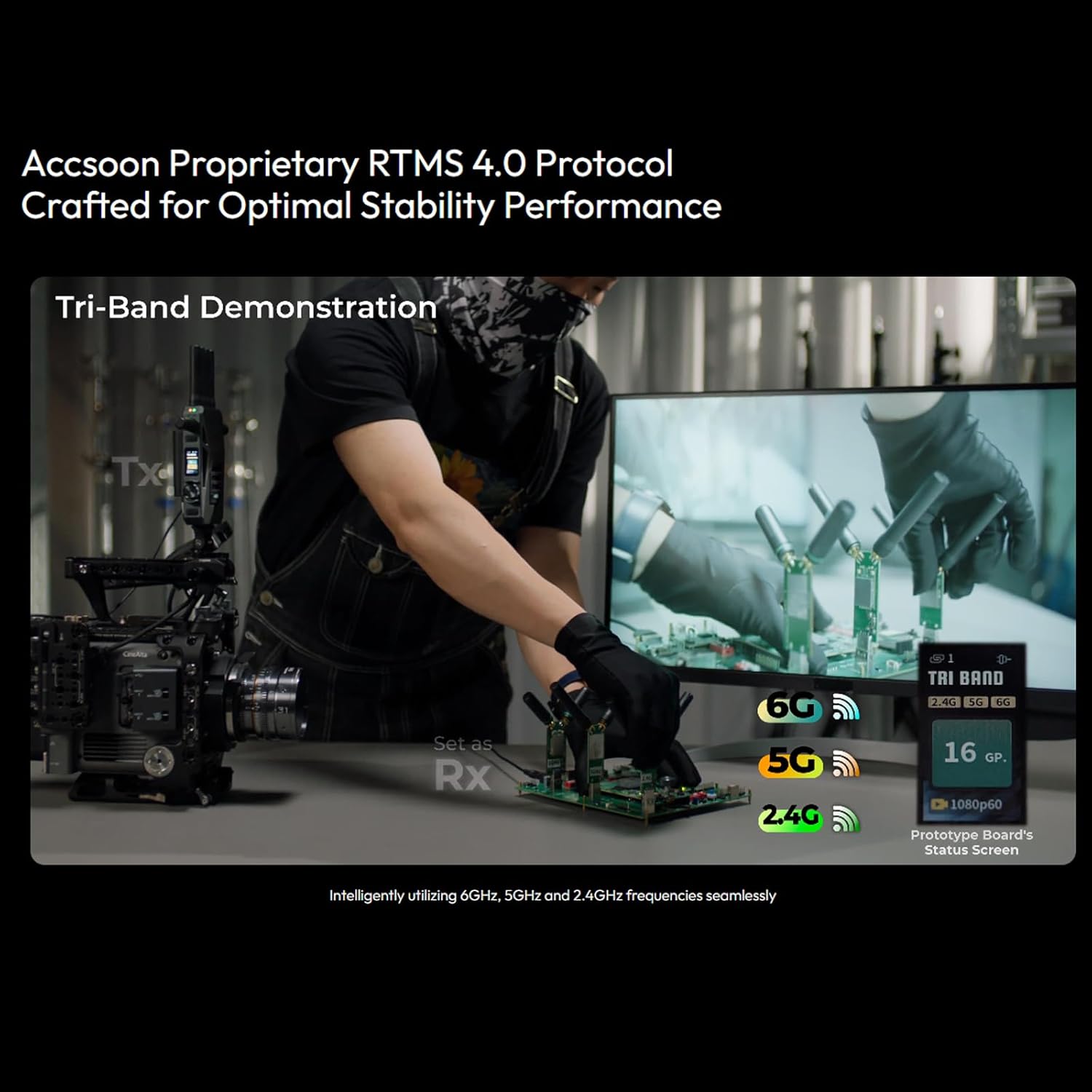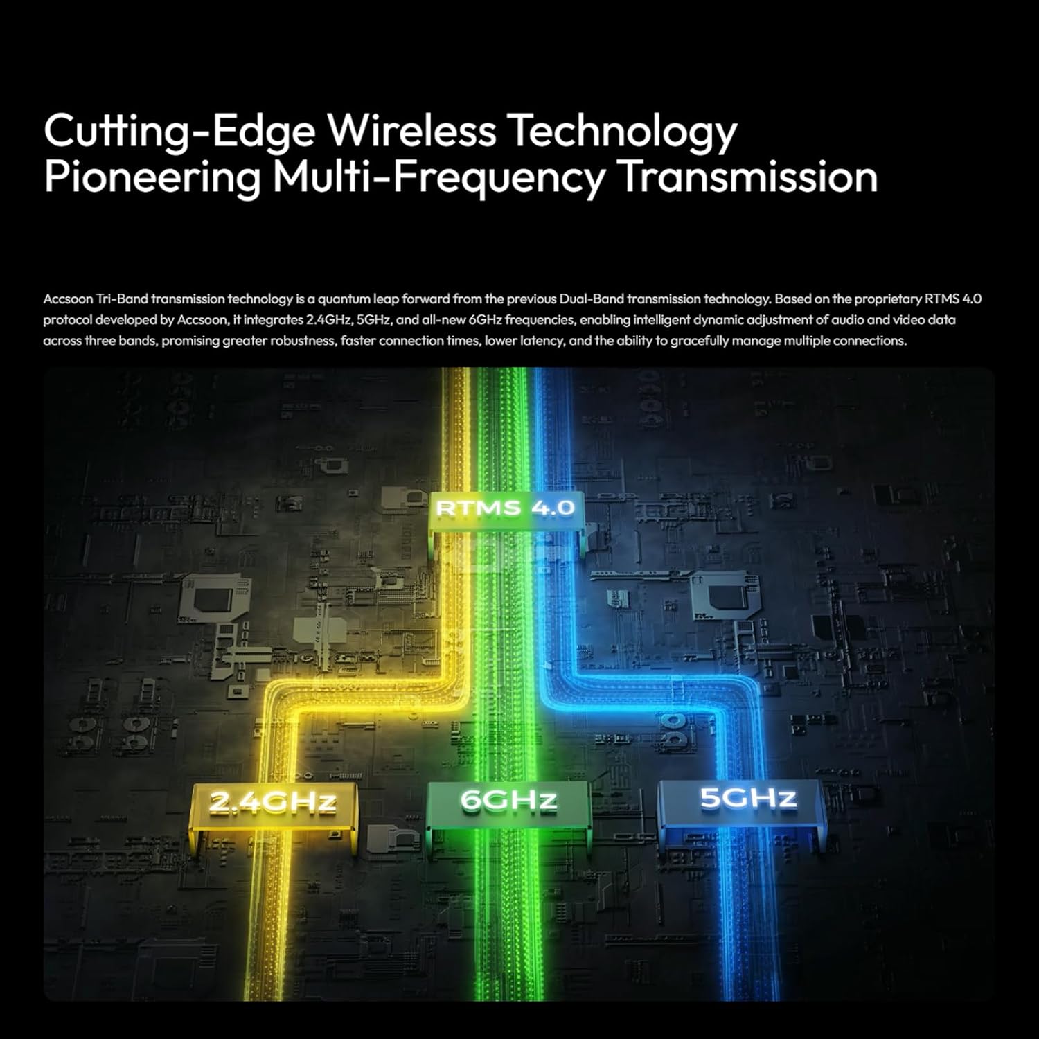 - [Cutting-Edge Wireless Technology Pioneering Multi-Frequency Transmission] Accsoon Tri-Band transmission technology is a quantum leap forward from the previous Dual-Band transmission technology. Based on the proprietary RTMS 4.0 protocol developed by Accsoon, it integrates 2.4GHz, 5GHz, and all-new 6GHz frequencies, enabling intelligent dynamic adjustment of audio and video data across three bands, promising greater robustness, faster connection times, lower latency, and the ability to gracefully manage multiple connections.