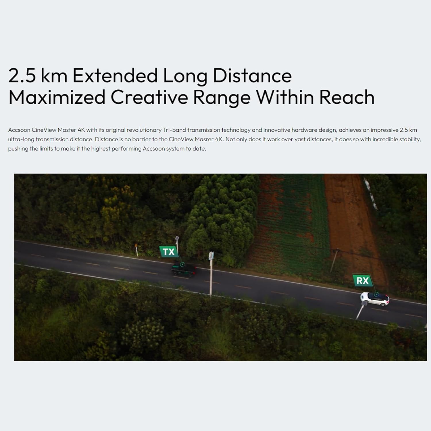 - [2.5 km Extended Long Distance Maximized Creative Range Within Reach] Accsoon CineView Master 4K with its original revolutionary Tri-band transmission technology and innovative hardware design, achieves an impressive 2.5 km ultra-long transmission distance. Distance is no barrier to the CineView Masrer 4K. Not only does it work over vast distances, it does so with incredible stability, pushing the limits to make it the highest performing Accsoon system to date.