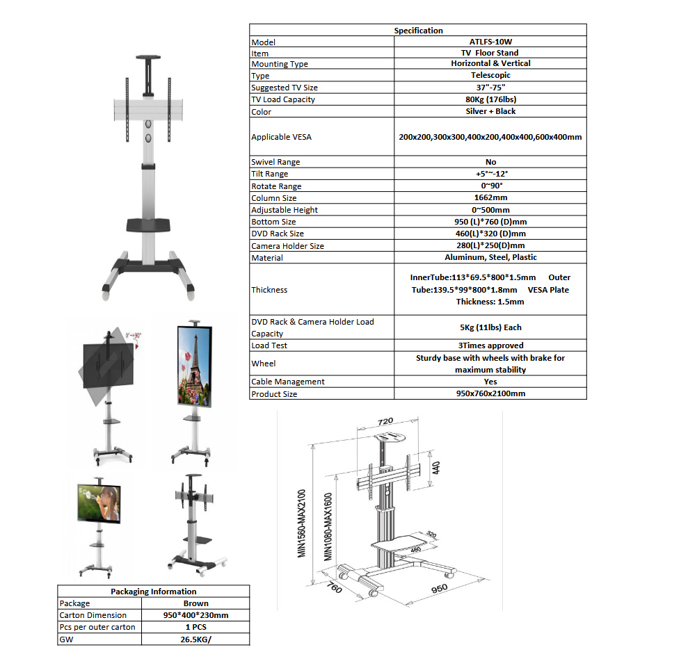 ATLFS-10W TV Cart can mount TVs Horizontal or Vertical, Support TV Size’s 37-75” with Max. Vesa Hole Size 0f 600x400mm and can load upto 80 Kg. Elegant Chrome Finish make attractive to use home, office, schools, hotels and events. Optional to use Video Conferencing Camera Holder and Rack to Keep electronic device safe and steadily