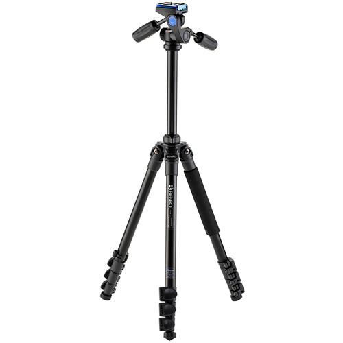 The 4.3 lb Adventure Aluminum Tripod with HD1A Pan and Tilt Head from Benro is an all-purpose four-section support with flip leg locks that open, so you can extend the legs along with the rapid center column to a maximum height of 60.4″. The tripod’s legs splay out to a second lower position of 15.7″ for macro or close-up photography.