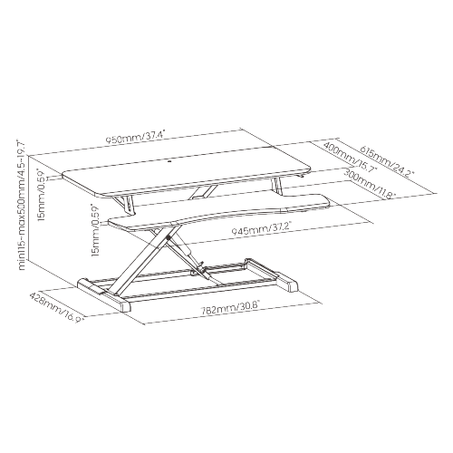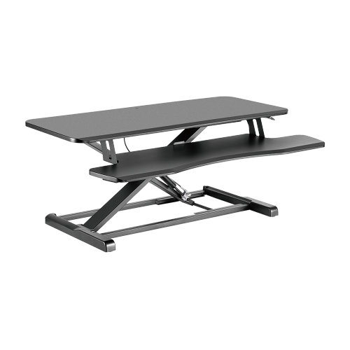 With an innovative gas spring X-Lift Structure comprised of flat crossmembers, the DWS34-02N Sit-Stand Desk Converter with Keyboard Tray provides a refreshing ergonomic sit-to-stand experience for users. The two-tier design with ample weight capacity provides plenty of worksurface for daily work. The quality 950 X 400mm (37.4”X 15.7”) MDF surface with chamfered edges is elegant and eye-pleasing. Plenty of space for monitors, keyboard, and mouse or use the lower tier for a laptop. Equipped with an easy-to-use squeeze handle for smooth and stable up-and-down height adjustments from 115mm (4.5”) to 500mm (19.7”). Additional features include a rear grommet hole for a monitor arm and non-slip pads that keep the converter in place while protecting against surface scratches.