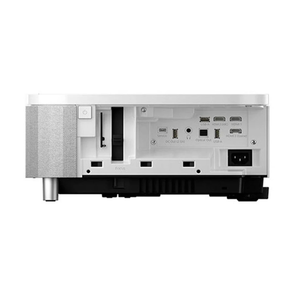 The Epson EH‑LS800W is a premium ultra-short-throw 4K PRO-UHD laser projector designed for home entertainment and “laser TV” experiences. It can project a large image from 80 to 150 inches while placed just a few centimeters from the wall, making it ideal for living rooms without ceiling installation. The projector uses 3LCD technology with 4,000 lumens brightness, HDR support, and a 20,000-hour laser light source for long-lasting performance. It also includes Android TV for streaming apps and a built-in Yamaha 2.1 speaker system, delivering both high-quality visuals and immersive sound in one compact device.