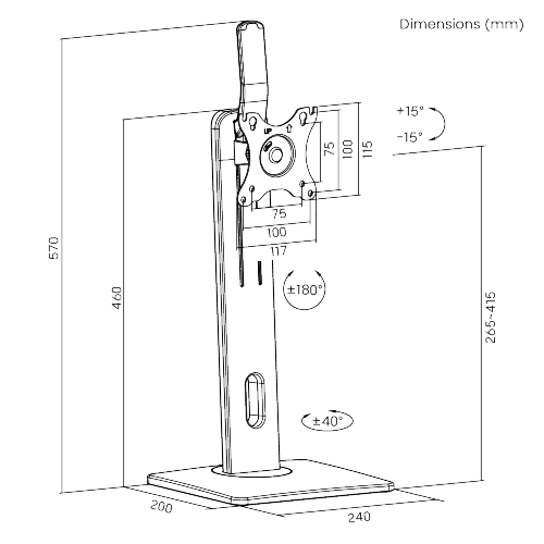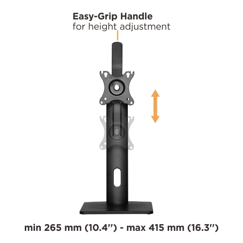 The LDT41-T01 Vertical Lift Monitor Stand fits most 17”-32” monitors, is the perfect ergonomic solution for spaces that may not accommodate a clamp or grommet mount. With an easy-grip handle, the stand can be positioned to most asked height levels for optimal viewing. The +15°~ -15° forward and back tilting and +40°~ – 40° swivel combined with portrait to landscape ability increases productivity and functionality. What’s more, a +40°~ -40° rotating base provides convenience for shared workspace and information sharing.
