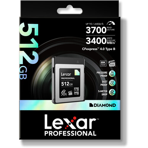 Experience the CFexpress 4.0 advantage and capture 8K raw cinema-quality video with the 512GB Professional DIAMOND CFexpress 4.0 Type B Memory Card from Lexar, which delivers read speeds of up to 3700 MB/s, write speeds of up to 3400 MB/s, and sustained write speeds of 3200 MB/s, all of which help to expedite post-production. Additionally, thanks to its VPG-400 rating, write speeds are guaranteed not to drop below 400 MB/s. Also featured is 8-point protection against temperatures, vibration, wear-out, dust (IP5X), drops, shocks, compression, and bends. Protection is provided by a limited lifetime warranty and data recovery software.