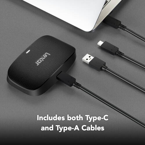 Offload from two cards simultaneously with the Professional CFexpress Type B/SD USB 3.2 Gen 2 Card Reader from Lexar. Built with one dedicated CFexpress Type B card slot and one dedicated UHS-II SDXC card slot, this reader utilizes the 10 Gb/s USB-C 3.2 Gen 2 standard, so you can quickly download high-quality images and raw 8K video. The CFexpress Type B slot features sequential read speeds up to 1050 MB/s and sequential write speeds up to 1000 MB/s, while the SDXC slot delivers sequential reads up to 300 MB/s and sequential write up to 260 MB/s when working with UHS-II media. When working with UHS-I media, sequential reads top out at 170 MB/s. This card reader features a USB-C interface and connects to your host system using either an included USB-C to USB-C or USB-C to USB-A cable.