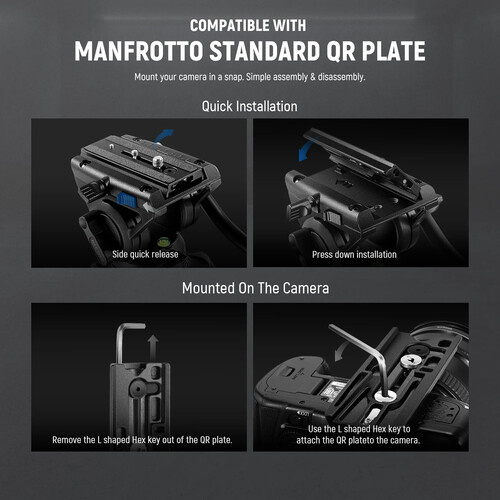- Compatible with the Manfrotto system, the quick release plate (built-in L-shaped Hex key) with 1/4″ and 3/8″ screws are compatible with various DSLR cameras, mirrorless cameras, camcorders, gimbals, video rigs, and more. A side 1/4″ thread connects accessories for expanding external devices, such as monitor, led light, and a magic arm.