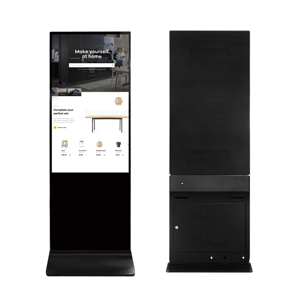 Designed for professional environments, the floor-standing enclosure features a slim profile with a robust metal housing. Its minimalist aesthetic complements any modern commercial space and enhances brand image without clutter.