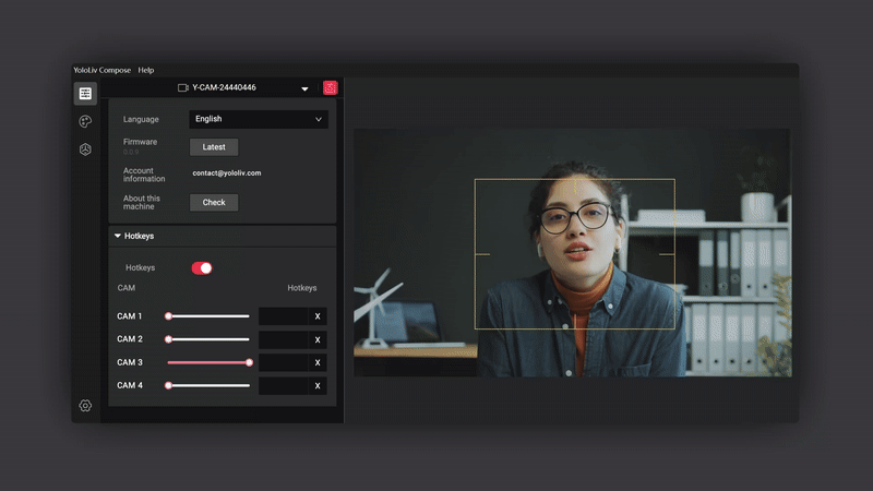 The powerful YoloLive Compose companion software can control multiple YoloCams in one app and provides numerous features to control the camera and the image, including: