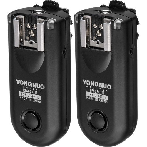 This RF-603C II Remote Flash Trigger Kit from Yongnuo features two 16 channel, 2.4 GHz transceivers as well as a shutter release cable for remote triggering of Canon cameras with a 3-Pin connection. Each transceiver has a male camera shoe on the bottom as well as a female hot shoe on top for triggering a flash unit. The system has a wireless range of 328′ and can sync at speeds up to 1/320 second. Additionally, it has a dual-function shutter release with half-press and full-press capabilities.